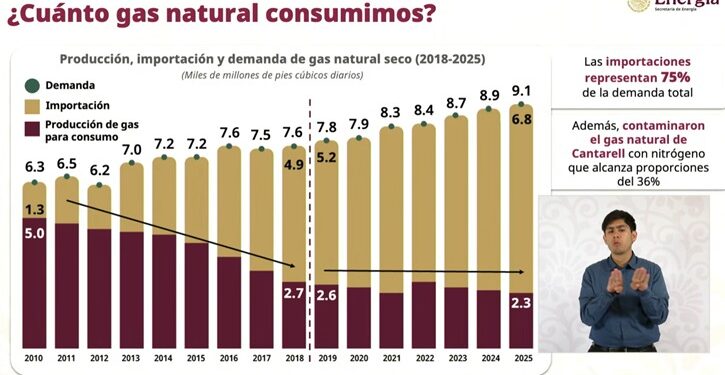Aunque desde 2018 se logró frenar la tendencia negativa en el sector energético, México aún enfrenta una alta dependencia del gas natural importado, que actualmente cubre cerca del 75 por ciento de la demanda nacional.